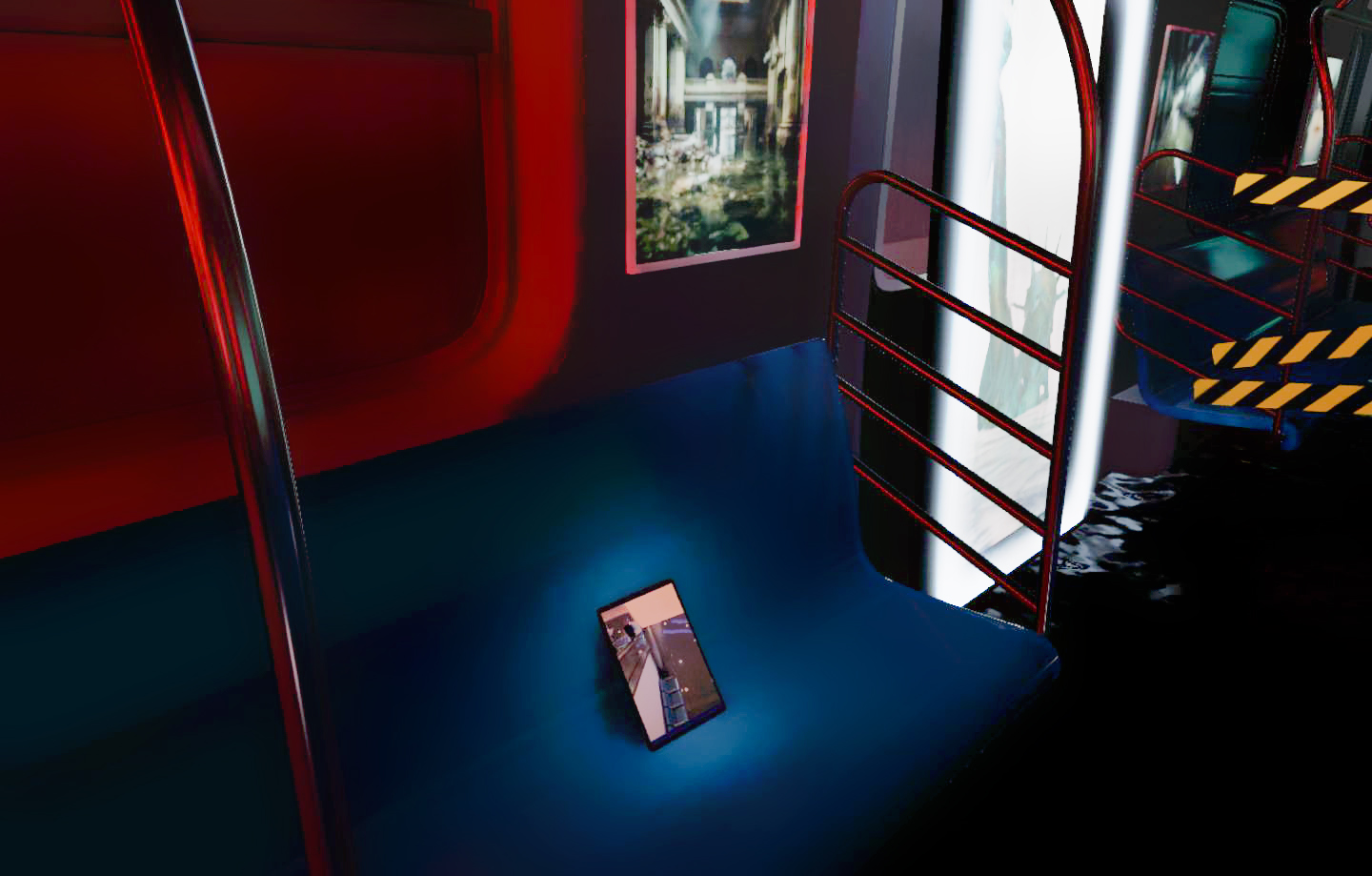 Additionally, the audience can access two other levels: the iconic Times Square, now submerged, where the viewer will stand on a scaffold surrounded by water, and a subway car in the process of being flooded, complete with emergency evacuation alerts. From the Times Square platform, viewers can transition to a 360-degree VR view of a utopian future