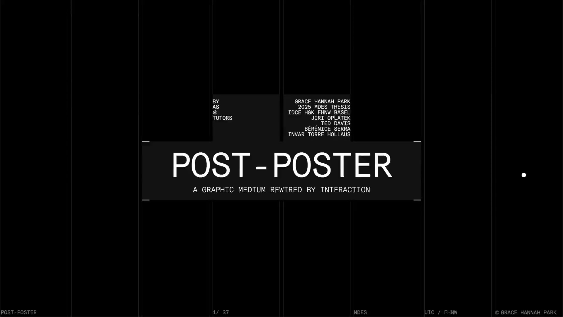 Grace Hannah Park navigates the spaces between type, motion, print, and code to question how medium shapes message. Her work often begins with noticing how a moving image can breathe new life into a static poster, or how certain ideas only make sense once printed, folded, or bound. Lately, she has been drawn to the tactile intelligence of street posters – their materiality, their presence – and how these qualities might be translated into digital formats. With a practice grounded in both formal design and experimental tools, she treats graphic design as a responsive system rather than a fixed outcome.